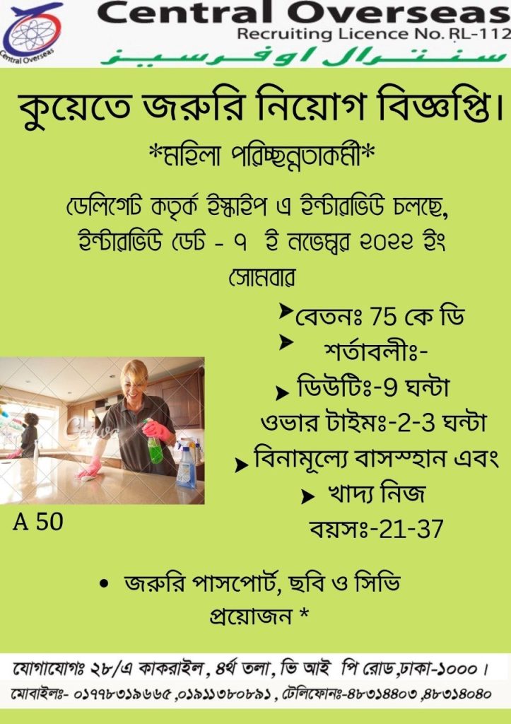 Housekeeping and household jobs are common choices for Bangladeshi women of rural areas who want to become independent wage earners to cater for their family needs, So I choose this profession by Central Overseas.